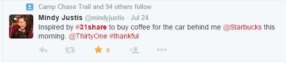 Remember– put #31share on your posts in the next few days! I’ll be looking for them and updating this post with what I see on Facebook, Twitter, and Instagram. Your random act could land in this article and inspire someone else!