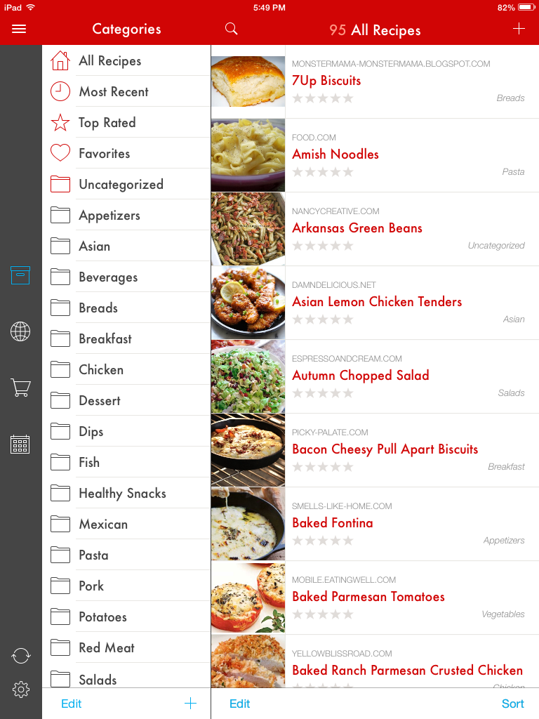 The app organizes your recipes into categories. Mine include everything from Dips to Healthy Snacks to Slow Cooker and Salad recipes. You also can give the recipes between 1 and 5 stars AND you can mark your favorites for the quickest access ever.