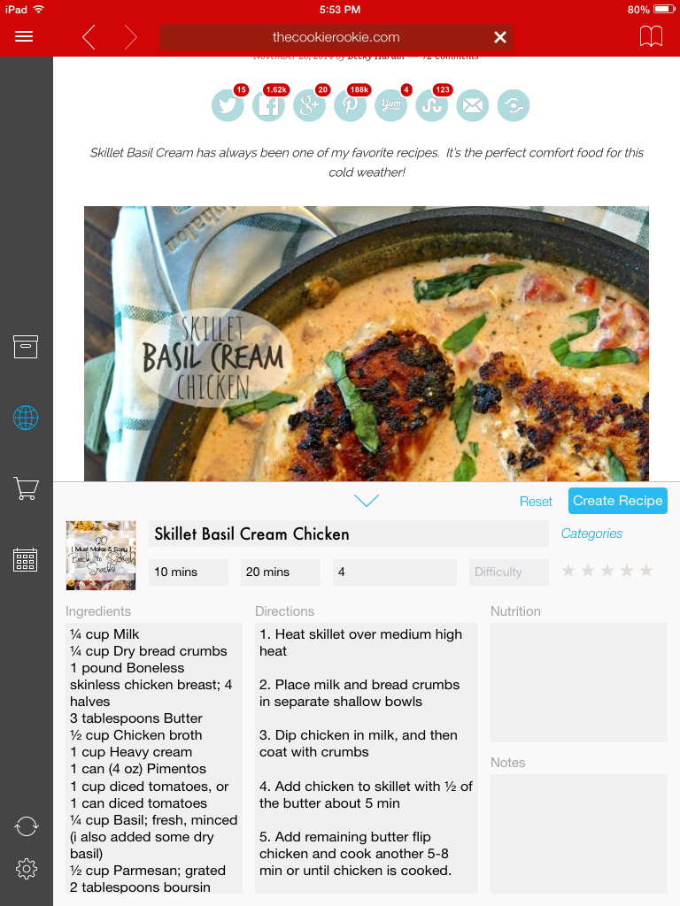 It looks a little less crazed because of Paprika. This app is amazing because it easily takes your favorite online recipes and puts them into a recipe box inside the app. I have it on my iPad but there is a version for iPhones. It recognizes the link you were in while you were inside Pinterest, and then in most scenarios it downloads the recipe right to your Paprika app! Three seconds. Magic. Worst case scenario, for a recipe on a website that is not download-friendly, you end up copying and pasting the recipe and the picture of the deliciousness. That takes all of one minute.